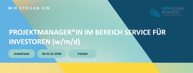 Die landeseigene Außenwirtschaftsförderungsgesellschaft NRW.Global Business ist Partner für Investitionsprojekte und Ansiedlungen in Nordrhein-Westfalen sowie bei der Erschließung von Wachstumsmärkten. Wir betreiben das internationale Standortmarketing für Deutschlands Investitionsstandort Nr. 1 und werben weltweit um ausländische Direktinvestitionen. Unsere Experten begleiten Investitionsprojekte vom ersten Schritt bis zur erfolgreichen Ansiedlung und darüber hinaus. Gemeinsam mit unseren Partnern entwickeln wir Außenwirtschaftsmaßnahmen wie Messebeteiligungen im Ausland, Delegations- und Unternehmensreisen sowie Branchen- und Kooperationsveranstaltungen zur Unterstützung beim Auf- und Ausbau des Auslandsgeschäfts.